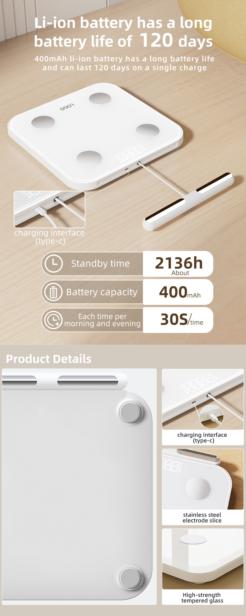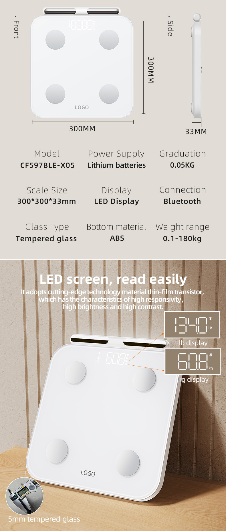 Product Material: Tempered Glass+ABS Product size: 30 * 30 * 3cm Display mode: LED display Display unit: KG Display switchable LB (pounds) Power supply method: USB charging